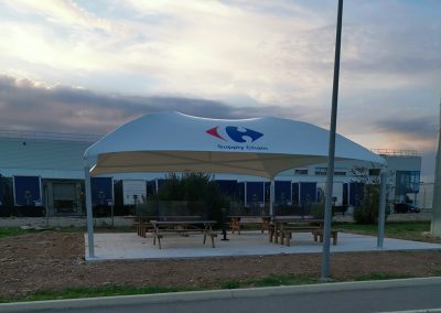 Déjà partenaire de l’enseigne pour plusieurs réalisations d’abris, Texabri a été choisie pour réaliser 2 structures métallo-textiles permettant de couvrir des espaces de repos extérieurs des employés de l’établissement.