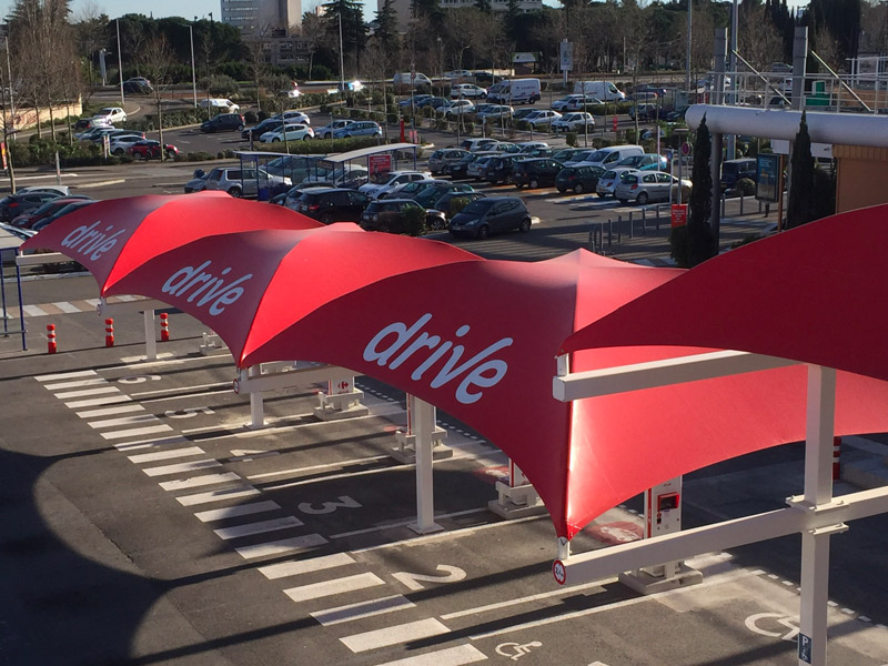 L’hypermarché Carrefour de Nîmes Ouest a souhaité mettre en place un abri en toile tendue attenant à son Drive.